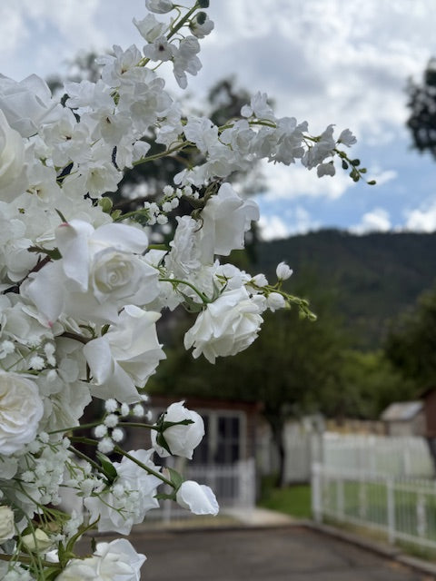 This floral installation is breathtaking. Composed entirely of white flowers, these sculptural forms are densely packed with a luxurious mix of white roses, peonies, orchids, delias,and hydrangeas, interspersed with delicate white baby's breath and soft, silvery eucalyptus leaves that add texture and cool-toned depth.
