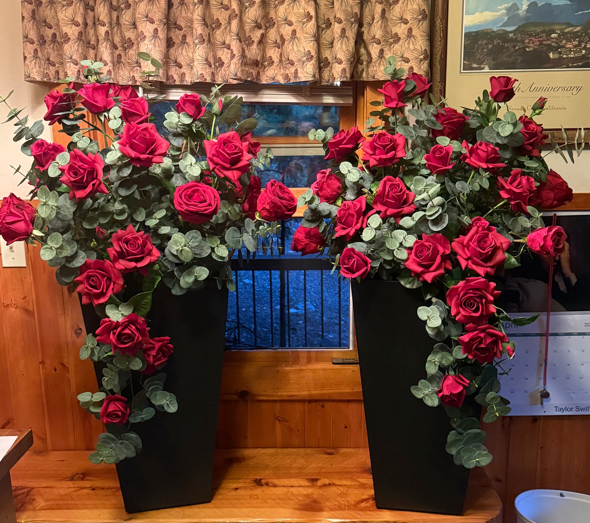 This striking floral design creates a bold and romantic atmosphere with dozens of vibrant red roses interwoven with soft baby's breath and eucalyptus. Pair with the Red arch adornment and make a striking ceremony location draped with black fabric. Works great for proposals too!