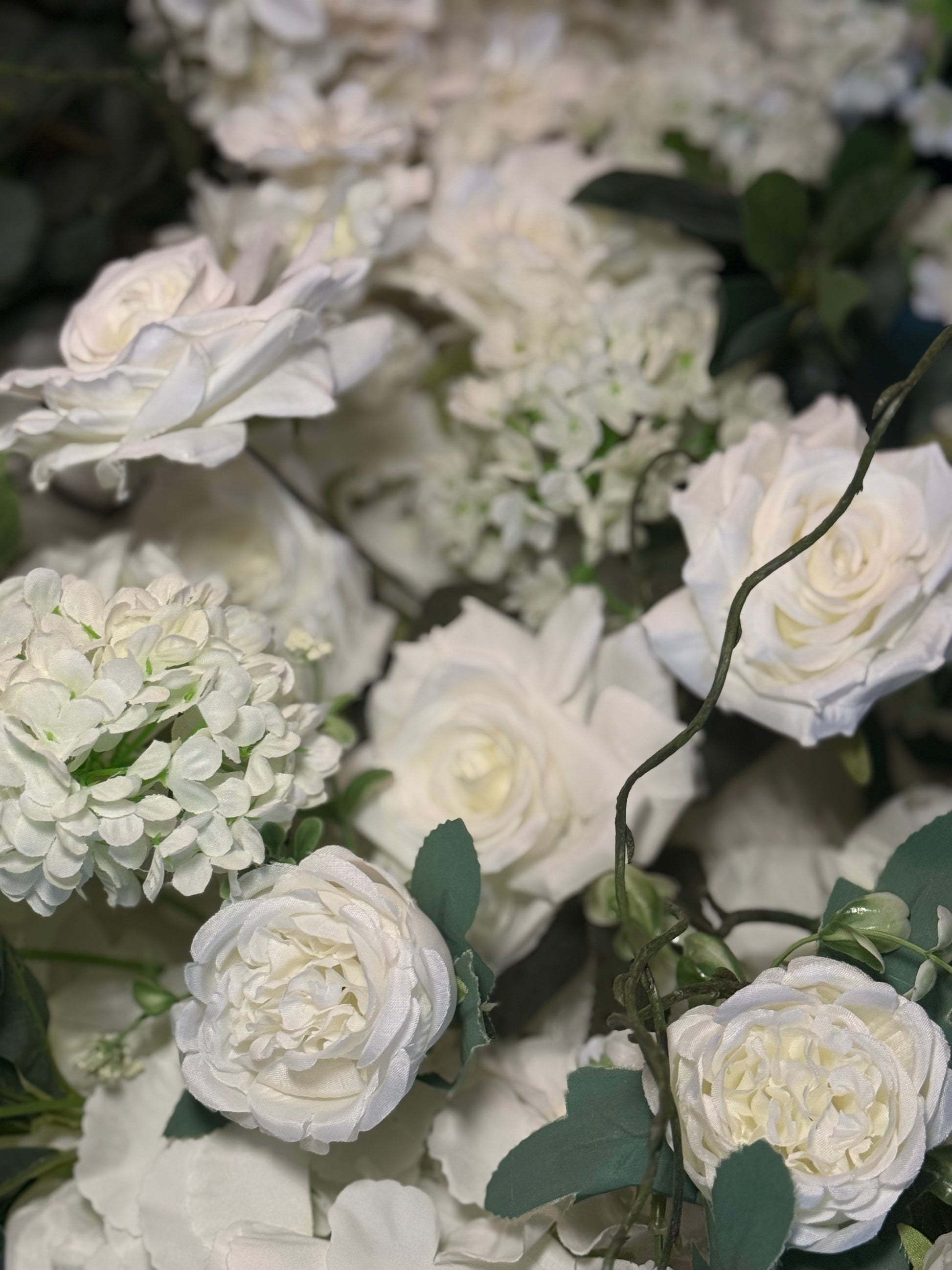This lush and striking floral wall features 5 layers of flowers and creates a spectacular floral backdrop that looks amazing in person and in photos. This wall features a neutral palette and includes roses, peonies, and spiral eucalyptus.