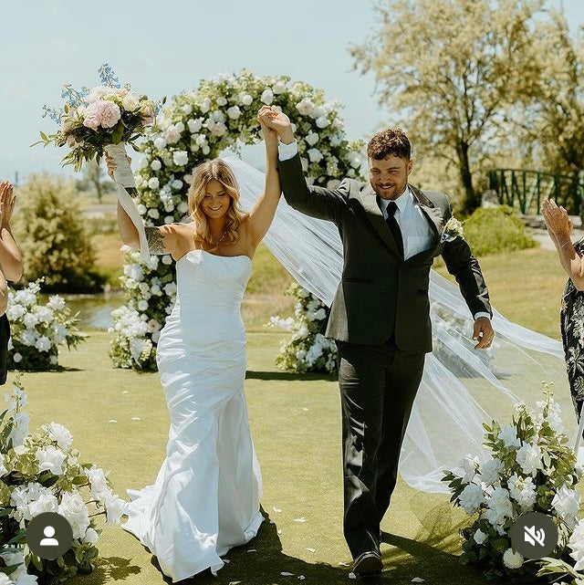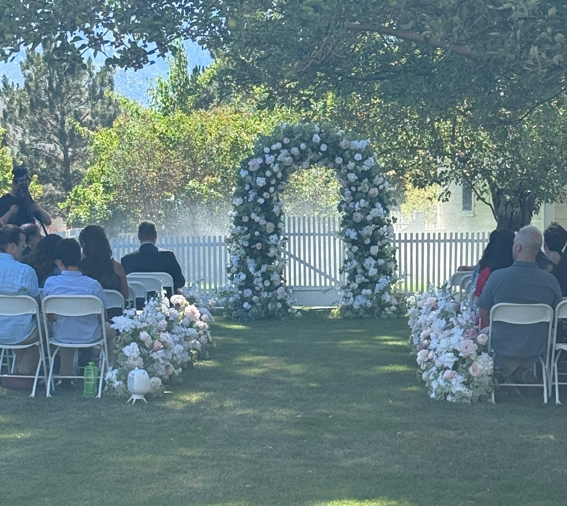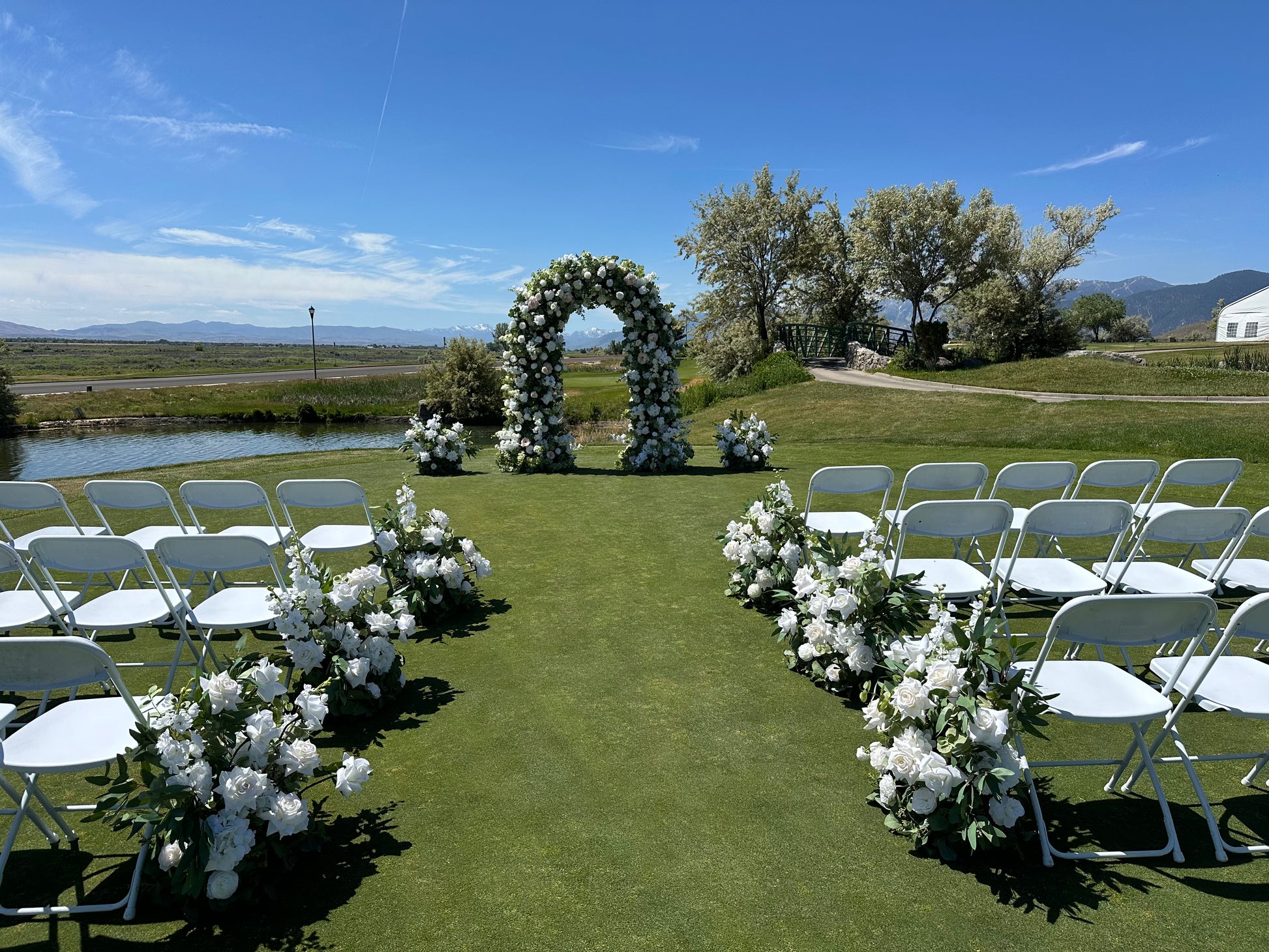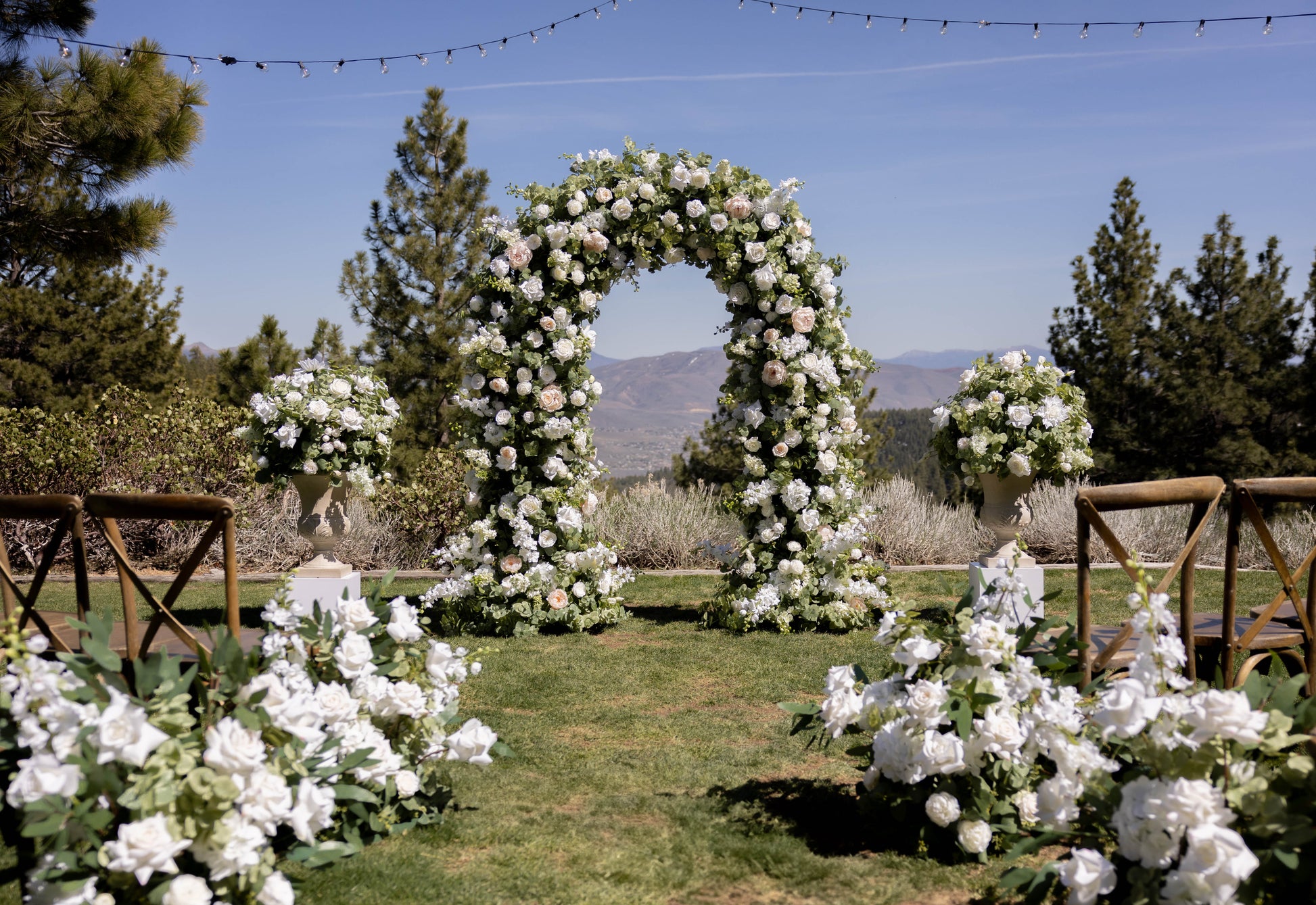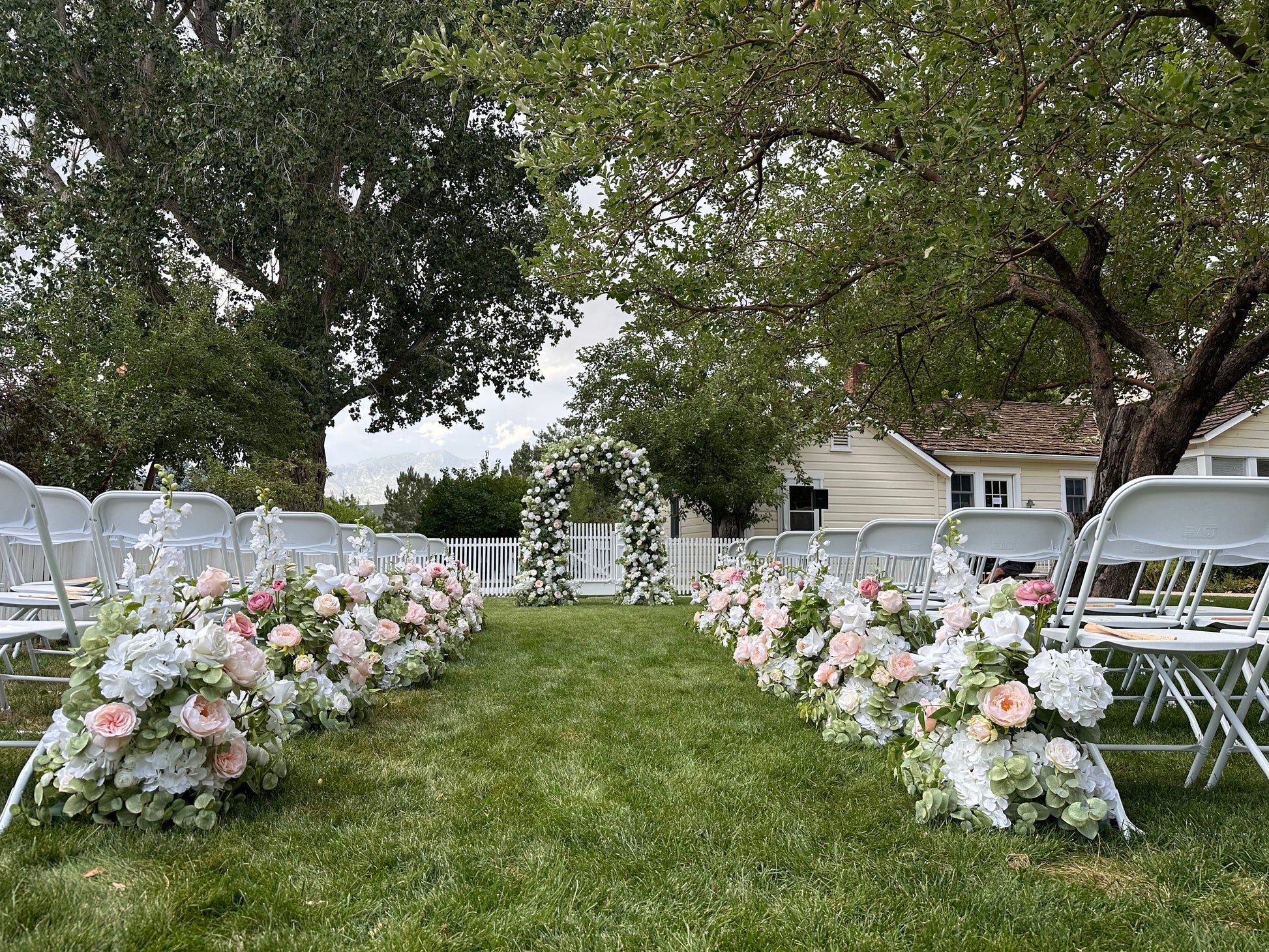 Evoke an elegant garden setting with the classic and picturesque Enchanted Arch. This fresh and full design uses the highest quality faux florals, balancing soft white florals with lush greenery. Timeless and sophisticated, the Enchanted Arch brings a garden in peak bloom to your event space. Meticulously designed, this arch features white delphinium, hydrangeas, white garden roses, white playa blanca roses, blush peonies, white ranunculus, ivory peonies, white lilac, ivory rose buds, and white lisianthus, interspersed with seeded eucalyptus, and sage spiral eucalyptus.